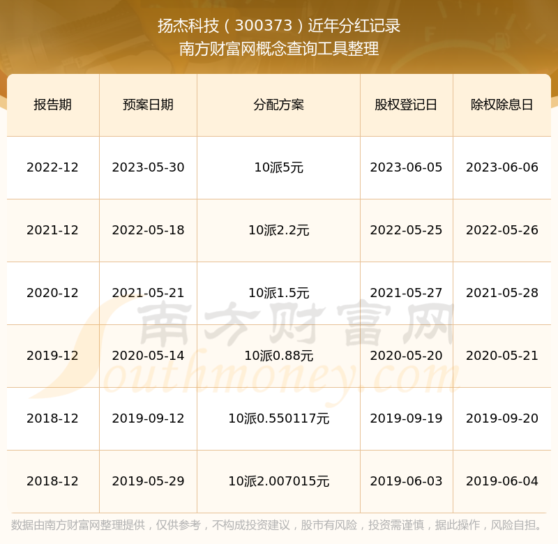 揚杰科技最新一次公布的分紅方案為10派5元。本次權益分派股權登記日為2023年6月5日,除權除息日為2023年6月6日,派息日為2023年6月6日。