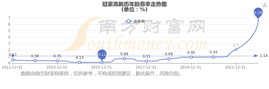 冠豪高新歷年股息率走勢(shì)如下圖: