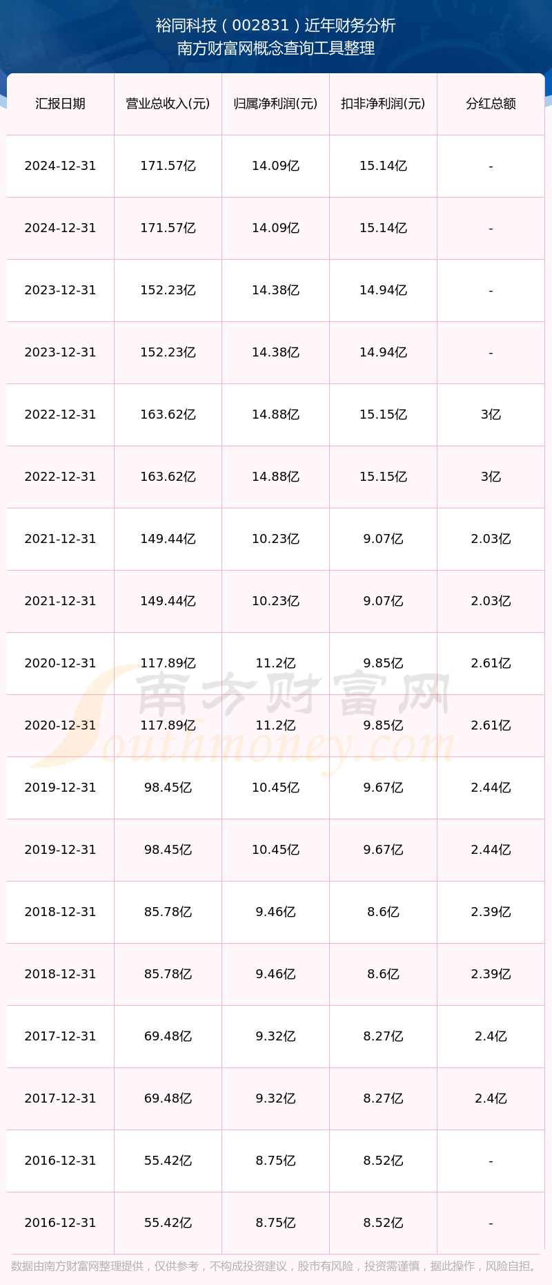 2024年裕同科技總營收171.57億,同比增長12.71%;凈利潤14.09億,同比增長-2.05%;銷售毛利率24.8%。
