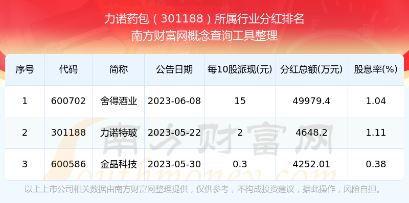 按照南方財富網(wǎng)趨勢選股系統(tǒng)統(tǒng)計,力諾藥包所屬行業(yè)為玻璃行業(yè),玻璃行業(yè)分紅排名情況如下表: