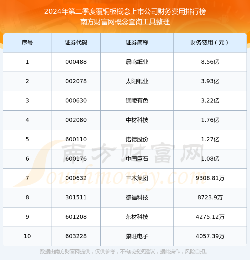 2024年第二季度覆銅板概念概念上市公司財(cái)務(wù)費(fèi)用排行榜如下:晨鳴紙業(yè)(000488)的財(cái)務(wù)費(fèi)用總額高達(dá)8.56億,太陽(yáng)紙業(yè)(002078)和銅陵有色(000630)分別排名第二和第三,中材科技(002080)、諾德股份(600110)、中國(guó)巨石(600176)、三木集團(tuán)(000632)、德?萍迹301511)、東材科技(601208)、景旺電子(603228)分別進(jìn)入前十,其財(cái)務(wù)費(fèi)用總額分別排名第4-10名。