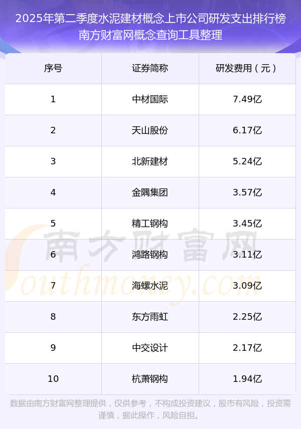 2025年第二季度水泥建材概念上市公司研發(fā)支出排行榜如下:中材國際(600970)研發(fā)支出總額高達(dá)7.49億,天山股份(000877)和北新建材(000786)分別排名第二和第三,金隅集團(tuán)(601992)、精工鋼構(gòu)(600496)、鴻路鋼構(gòu)(002541)、海螺水泥(600585)、東方雨虹(002271)、中交設(shè)計(jì)(600720)、杭蕭鋼構(gòu)(600477)分別進(jìn)入前十,其研發(fā)支出總額分別排名第4-10名。