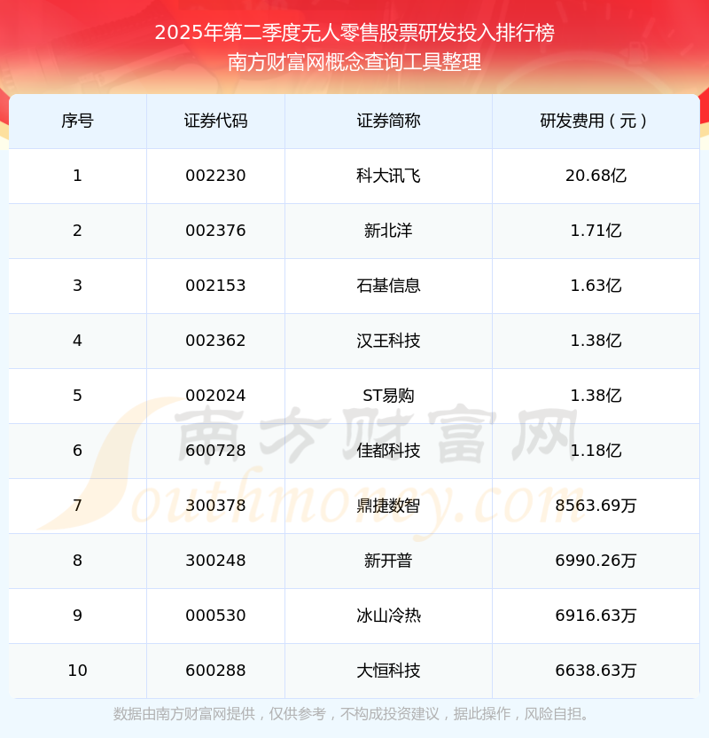 2025年第二季度,無人零售股票研發(fā)投入排名如下:科大訊飛(002230)研發(fā)投入總額高達20.68億,新北洋(002376)和石基信息(002153)分別位居第二和第三,漢王科技(002362)、ST易購(002024)、佳都科技(600728)、鼎捷數(shù)智(300378)、新開普(300248)、冰山冷熱(000530)、大恒科技(600288)分別進入前十,其研發(fā)投入總額分別排名第4-10名。