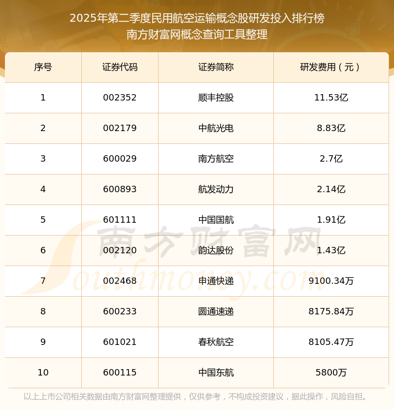 2025年第二季度民用航空運輸概念股研發(fā)投入排行榜如下:順豐控股(002352)研發(fā)投入總額高達11.53億,中航光電(002179)和南方航空(600029)分別排名第二和第三,航發(fā)動力(600893)、中國國航(601111)、韻達股份(002120)、申通快遞(002468)、圓通速遞(600233)、春秋航空(601021)、中國東航(600115)分別進入前十,其研發(fā)投入總額分別排名第4-10名。