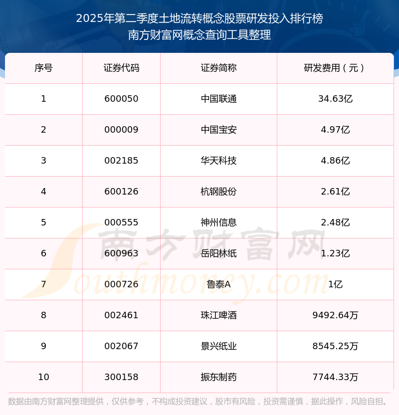 2025年第二季度,土地流轉(zhuǎn)概念股票研發(fā)投入排名如下:中國聯(lián)通(600050)研發(fā)投入總額高達(dá)34.63億,中國寶安(000009)和華天科技(002185)分別位居第二和第三,杭鋼股份(600126)、神州信息(000555)、岳陽林紙(600963)、魯泰A(000726)、珠江啤酒(002461)、景興紙業(yè)(002067)、振東制藥(300158)分別進(jìn)入前十,其研發(fā)投入總額分別排名第4-10名。