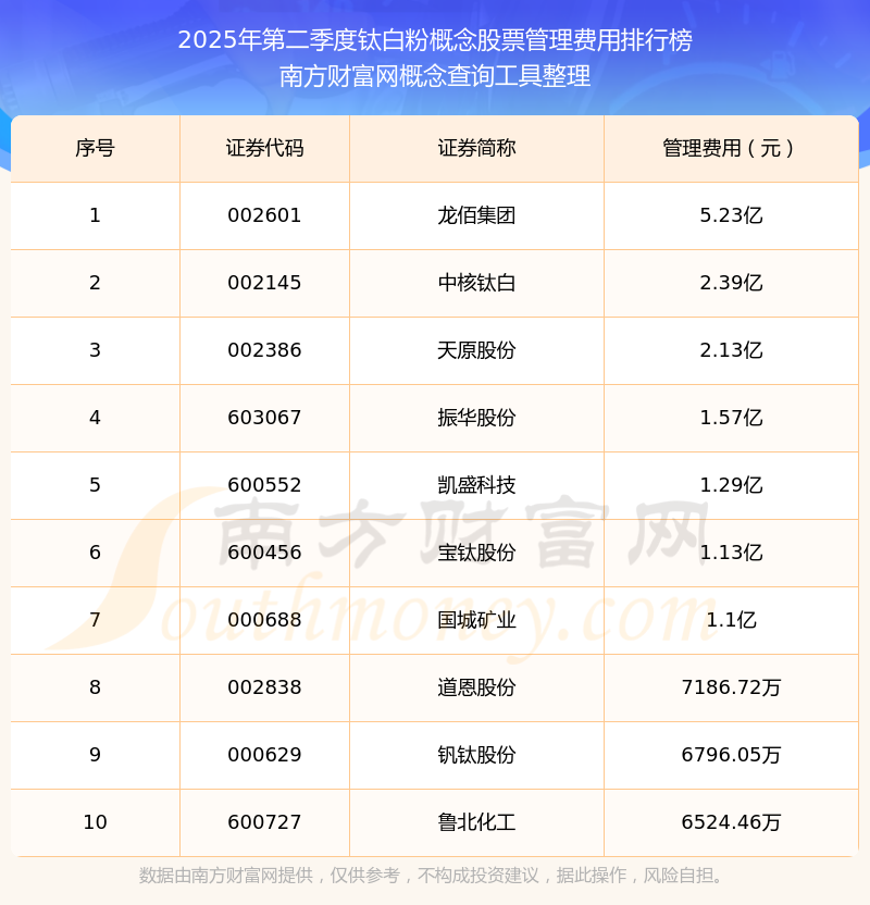 2025年第二季度,鈦白粉概念股票管理費用排行榜如下:龍佰集團(002601)的管理費用總額高達5.23億,中核鈦白(002145)和天原股份(002386)分別排名第二和第三,振華股份(603067)、凱盛科技(600552)、寶鈦股份(600456)、國城礦業(yè)(000688)、道恩股份(002838)、釩鈦股份(000629)、魯北化工(600727)分別進入前十,其管理費用總額分別排名第4-10名。