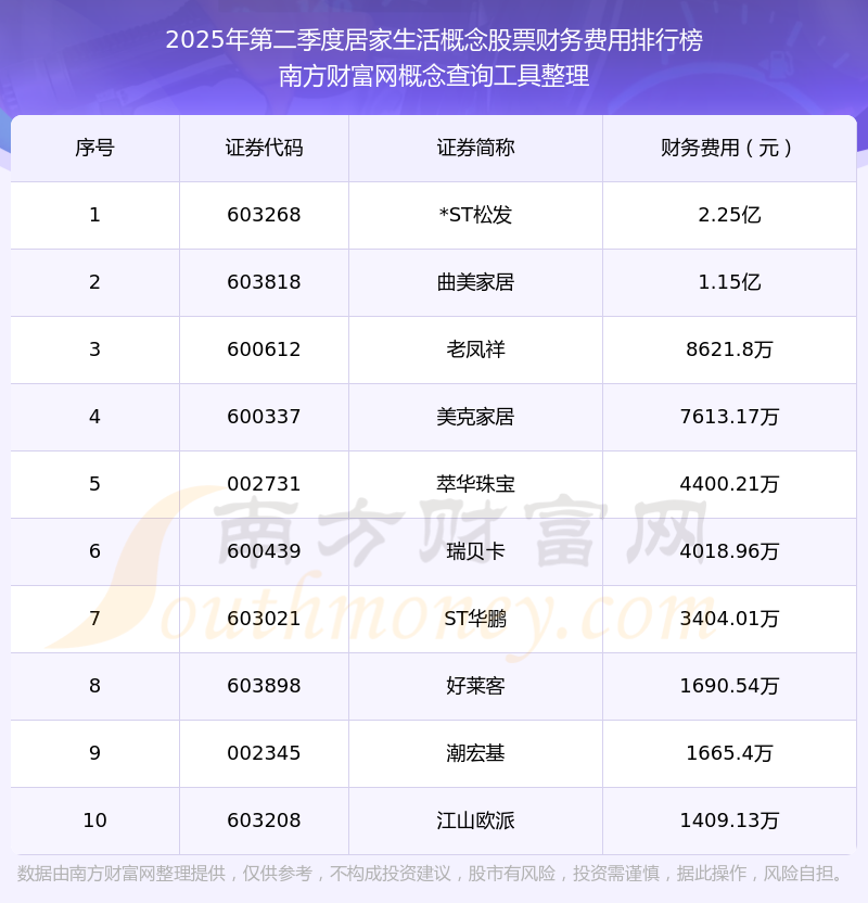 2025年第二季度,居家生活概念股票財(cái)務(wù)費(fèi)用排行榜中,*ST松發(fā)(603268)財(cái)務(wù)費(fèi)用總額高達(dá)2.25億,曲美家居(603818)和老鳳祥(600612)排名第二和第三,美克家居(600337)、萃華珠寶(002731)、瑞貝卡(600439)、ST華鵬(603021)、好萊客(603898)、潮宏基(002345)、江山歐派(603208)進(jìn)入前十,財(cái)務(wù)費(fèi)用總額分別排名第4-10名。