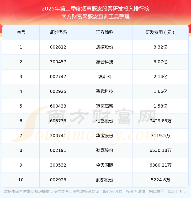 2025年第二季度,煙草概念股票研發(fā)投入排行榜中,恩捷股份(002812)研發(fā)投入總額高達3.32億,贏合科技(300457)和埃斯頓(002747)位居第二和第三,盈趣科技(002925)、冠豪高新(600433)、仙鶴股份(603733)、華寶股份(300741)、勁嘉股份(002191)、今天國際(300532)、潤都股份(002923)進入前十,研發(fā)投入總額分別排名第4-10名。