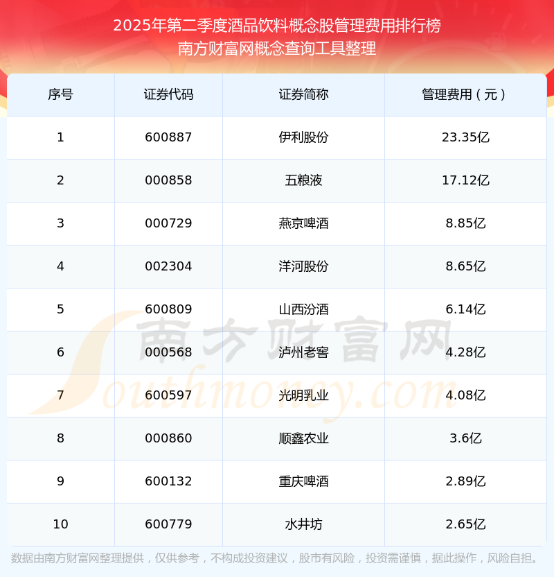 2025年第二季度,酒品飲料概念股管理費(fèi)用排名如下:伊利股份(600887)的管理費(fèi)用總額高達(dá)23.35億,五糧液(000858)和燕京啤酒(000729)位居第二和第三,洋河股份(002304)、山西汾酒(600809)、瀘州老窖(000568)、光明乳業(yè)(600597)、順鑫農(nóng)業(yè)(000860)、重慶啤酒(600132)、水井坊(600779)分別進(jìn)入前十,其管理費(fèi)用總額分別排名第4-10名。