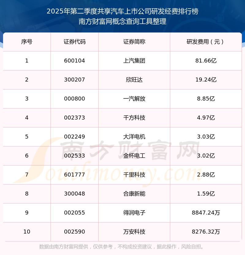 2025年第二季度,共享汽車上市公司研發(fā)經(jīng)費(fèi)排行榜中,上汽集團(tuán)(600104)研發(fā)經(jīng)費(fèi)總額高達(dá)81.66億,欣旺達(dá)(300207)和一汽解放(000800)位居第二和第三,千方科技(002373)、大洋電機(jī)(002249)、金杯電工(002533)、千里科技(601777)、合康新能(300048)、得潤(rùn)電子(002055)、萬(wàn)安科技(002590)進(jìn)入前十,研發(fā)經(jīng)費(fèi)總額分別排名第4-10名。