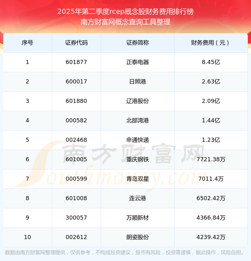 2025年第二季度rcep概念股財務費用排行榜如下:正泰電器(601877)的財務費用總額高達8.45億,日照港(600017)和遼港股份(601880)分別位居第二和第三,北部灣港(000582)、申通快遞(002468)、重慶鋼鐵(601005)、青島雙星(000599)、連云港(601008)、萬順新材(300057)、朗姿股份(002612)分別進入前十,其財務費用總額分別排名第4-10名。