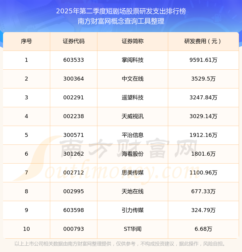 2025年第二季度,短劇場(chǎng)股票研發(fā)支出排行榜中,掌閱科技(603533)研發(fā)支出總額高達(dá)9591.61萬(wàn),中文在線(300364)和遙望科技(002291)排名第二和第三,天威視訊(002238)、平治信息(300571)、?垂煞荩301262)、思美傳媒(002712)、天地在線(002995)、引力傳媒(603598)、ST華聞(000793)進(jìn)入前十,研發(fā)支出總額分別排名第4-10名。