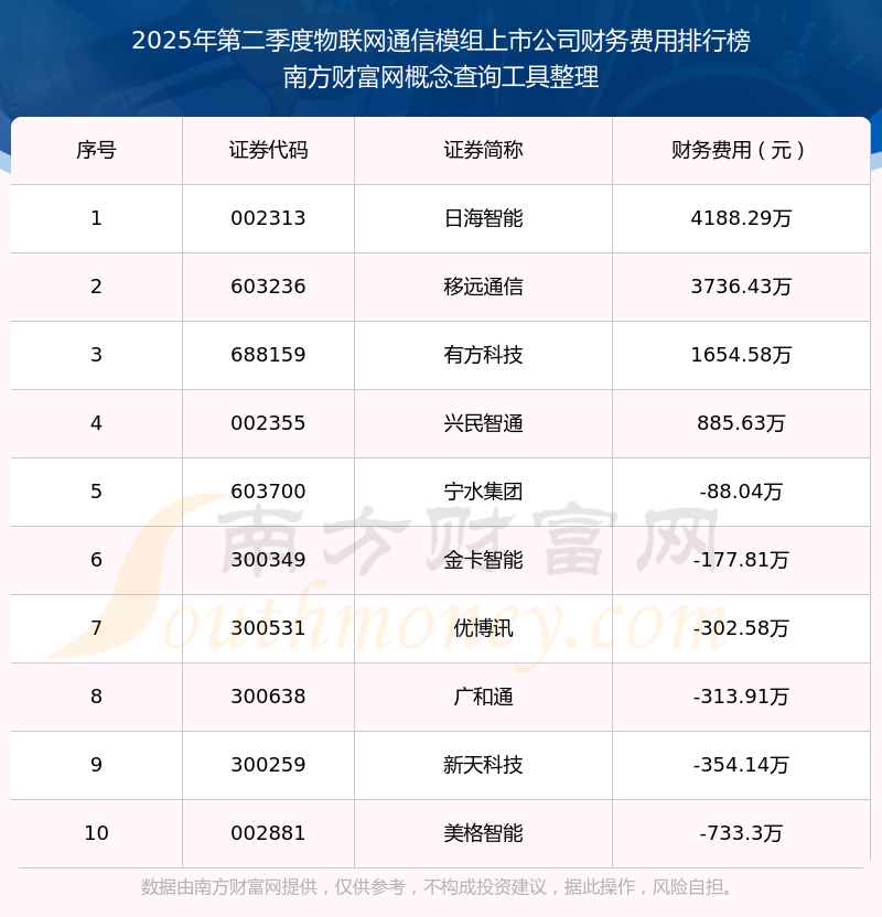2025年第二季度,物聯(lián)網(wǎng)通信模組上市公司財務費用排行榜中,日海智能(002313)財務費用總額高達4188.29萬,移遠通信(603236)和有方科技(688159)位居第二和第三,興民智通(002355)、寧水集團(603700)、金卡智能(300349)、優(yōu)博訊(300531)、廣和通(300638)、新天科技(300259)、美格智能(002881)進入前十,財務費用總額分別排名第4-10名。