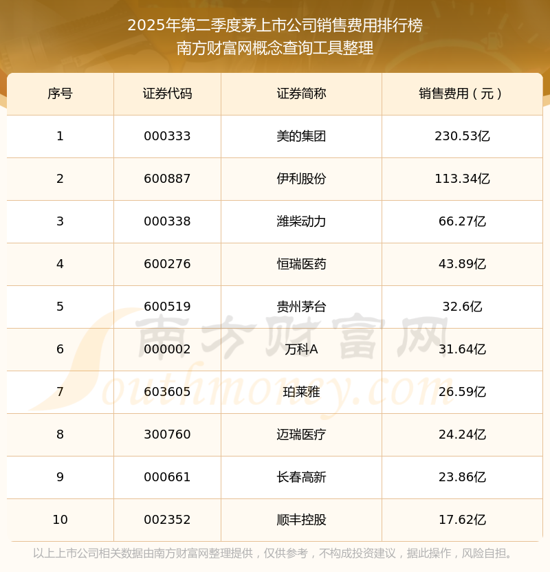 2025年第二季度,茅上市公司銷售費(fèi)用排名中,美的集團(tuán)(000333)銷售費(fèi)用總額高達(dá)230.53億,伊利股份(600887)和濰柴動(dòng)力(000338)排名第二和第三,恒瑞醫(yī)藥(600276)、貴州茅臺(tái)(600519)、萬科A(000002)、珀萊雅(603605)、邁瑞醫(yī)療(300760)、長(zhǎng)春高新(000661)、順豐控股(002352)進(jìn)入前十,銷售費(fèi)用總額分別排名第4-10名。