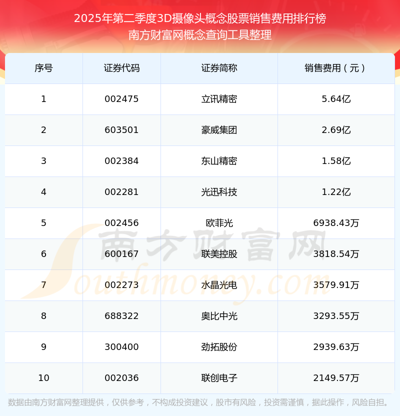 2025年第二季度,3D攝像頭概念股票銷售費用排行榜如下:立訊精密(002475)的銷售費用總額高達5.64億,豪威集團(603501)和東山精密(002384)分別排名第二和第三,光迅科技(002281)、歐菲光(002456)、聯(lián)美控股(600167)、水晶光電(002273)、奧比中光(688322)、勁拓股份(300400)、聯(lián)創(chuàng)電子(002036)分別進入前十,其銷售費用總額分別排名第4-10名。
