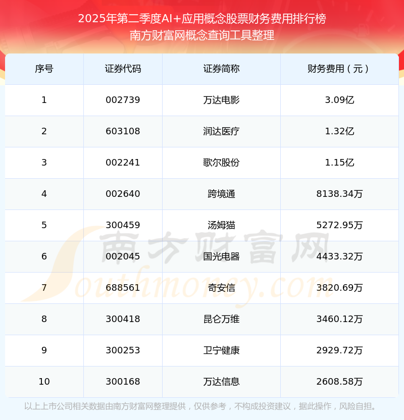 2025年第二季度,AI+應(yīng)用概念股票財務(wù)費(fèi)用排名如下:萬達(dá)電影(002739)的財務(wù)費(fèi)用總額高達(dá)3.09億,潤達(dá)醫(yī)療(603108)和歌爾股份(002241)分別位居第二和第三,跨境通(002640)、湯姆貓(300459)、國光電器(002045)、奇安信(688561)、昆侖萬維(300418)、衛(wèi)寧健康(300253)、萬達(dá)信息(300168)分別進(jìn)入前十,其財務(wù)費(fèi)用總額分別排名第4-10名。