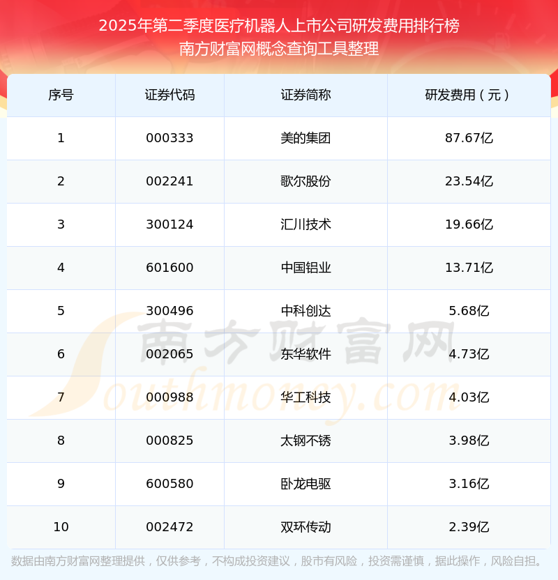2025年第二季度,醫(yī)療機(jī)器人上市公司研發(fā)費(fèi)用排行榜中,美的集團(tuán)(000333)研發(fā)費(fèi)用總額高達(dá)87.67億,歌爾股份(002241)和匯川技術(shù)(300124)排名第二和第三,中國(guó)鋁業(yè)(601600)、中科創(chuàng)達(dá)(300496)、東華軟件(002065)、華工科技(000988)、太鋼不銹(000825)、臥龍電驅(qū)(600580)、雙環(huán)傳動(dòng)(002472)進(jìn)入前十,研發(fā)費(fèi)用總額分別排名第4-10名。