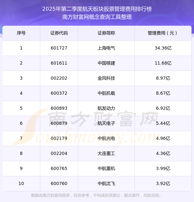 2025年第二季度,航天板塊股票管理費用排行榜中,上海電氣(601727)的管理費用總額高達34.36億,中國核建(601611)和金風科技(002202)分別位居第二和第三,中航機載(600372)、航發(fā)動力(600893)、航天電子(600879)、中航光電(002179)、大連重工(002204)、中航重機(600765)、中航沈飛(600760)分別進入前十,其管理費用總額分別排名第4-10名。