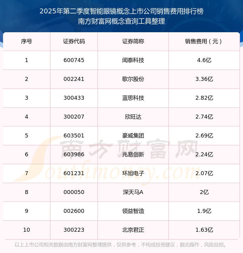 2025年第二季度,智能眼鏡概念上市公司銷售費用排行榜如下:聞泰科技(600745)的銷售費用總額高達4.6億,歌爾股份(002241)和藍思科技(300433)分別排名第二和第三,欣旺達(300207)、豪威集團(603501)、兆易創(chuàng)新(603986)、環(huán)旭電子(601231)、深天馬A(000050)、領益智造(002600)、北京君正(300223)分別進入前十,其銷售費用總額分別排名第4-10名。