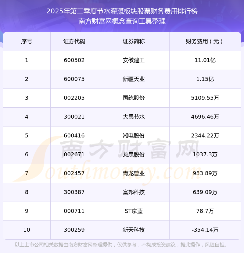 2025年第二季度節(jié)水灌溉板塊股票財(cái)務(wù)費(fèi)用排行榜如下:安徽建工(600502)的財(cái)務(wù)費(fèi)用總額高達(dá)11.01億,新疆天業(yè)(600075)和國(guó)統(tǒng)股份(002205)分別排名第二和第三,大禹節(jié)水(300021)、湘電股份(600416)、龍泉股份(002671)、青龍管業(yè)(002457)、富邦科技(300387)、ST京藍(lán)(000711)、新天科技(300259)分別進(jìn)入前十,其財(cái)務(wù)費(fèi)用總額分別排名第4-10名。