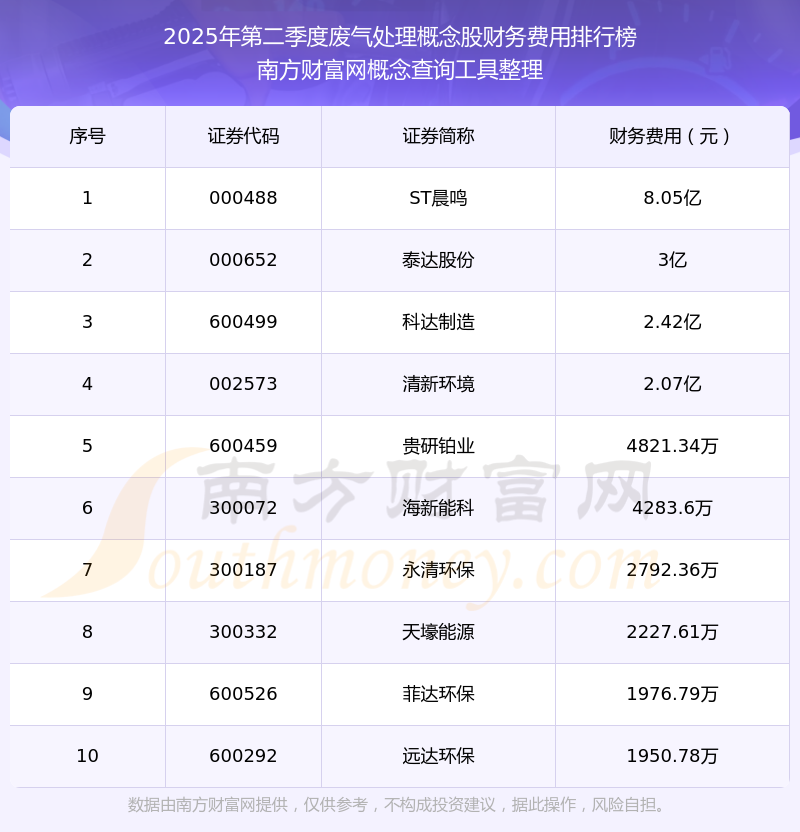 2025年第二季度,廢氣處理概念股財(cái)務(wù)費(fèi)用排行榜中,ST晨鳴(000488)財(cái)務(wù)費(fèi)用總額高達(dá)8.05億,泰達(dá)股份(000652)和科達(dá)制造(600499)位居第二和第三,清新環(huán)境(002573)、貴研鉑業(yè)(600459)、海新能科(300072)、永清環(huán)保(300187)、天壕能源(300332)、菲達(dá)環(huán)保(600526)、遠(yuǎn)達(dá)環(huán)保(600292)進(jìn)入前十,財(cái)務(wù)費(fèi)用總額分別排名第4-10名。