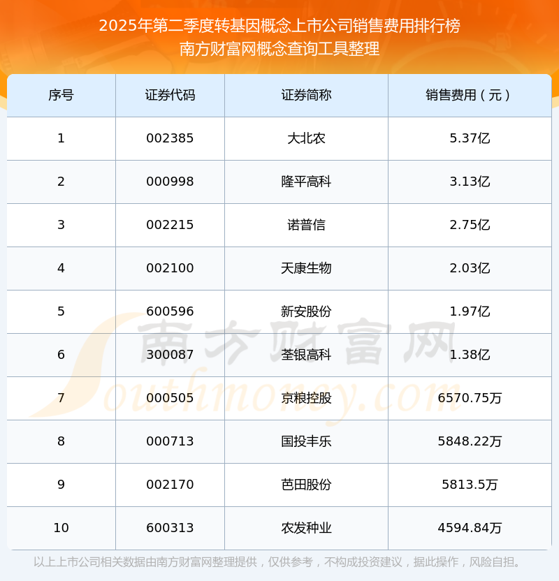 2025年第二季度,轉(zhuǎn)基因概念上市公司銷售費(fèi)用排行榜如下:大北農(nóng)(002385)的銷售費(fèi)用總額高達(dá)5.37億,隆平高科(000998)和諾普信(002215)分別位居第二和第三,天康生物(002100)、新安股份(600596)、荃銀高科(300087)、京糧控股(000505)、國(guó)投豐樂(lè)(000713)、芭田股份(002170)、農(nóng)發(fā)種業(yè)(600313)分別進(jìn)入前十,其銷售費(fèi)用總額分別排名第4-10名。