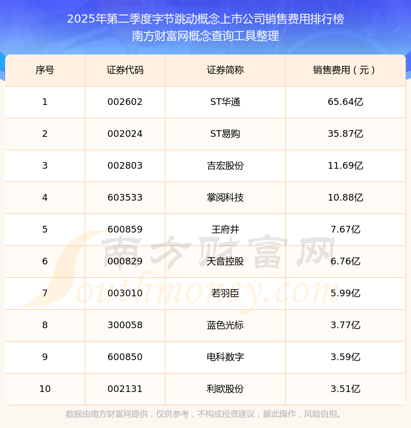 2025年第二季度,字節(jié)跳動概念概念上市公司銷售費用排行榜如下:ST華通(002602)的銷售費用總額高達65.64億,ST易購(002024)和吉宏股份(002803)分別位居第二和第三,掌閱科技(603533)、王府井(600859)、天音控股(000829)、若羽臣(003010)、藍色光標(300058)、電科數字(600850)、利歐股份(002131)分別進入前十,其銷售費用總額分別排名第4-10名。
