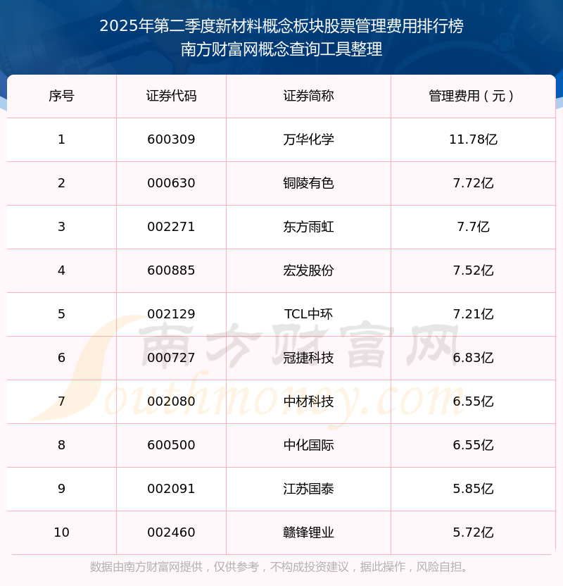 2025年第二季度,新材料概念板塊股票管理費(fèi)用排名中,萬華化學(xué)(600309)的管理費(fèi)用總額高達(dá)11.78億,銅陵有色(000630)和東方雨虹(002271)排名第二和第三,宏發(fā)股份(600885)、TCL中環(huán)(002129)、冠捷科技(000727)、中材科技(002080)、中化國際(600500)、江蘇國泰(002091)、贛鋒鋰業(yè)(002460)進(jìn)入前十,其管理費(fèi)用總額分別排名第4-10名。
