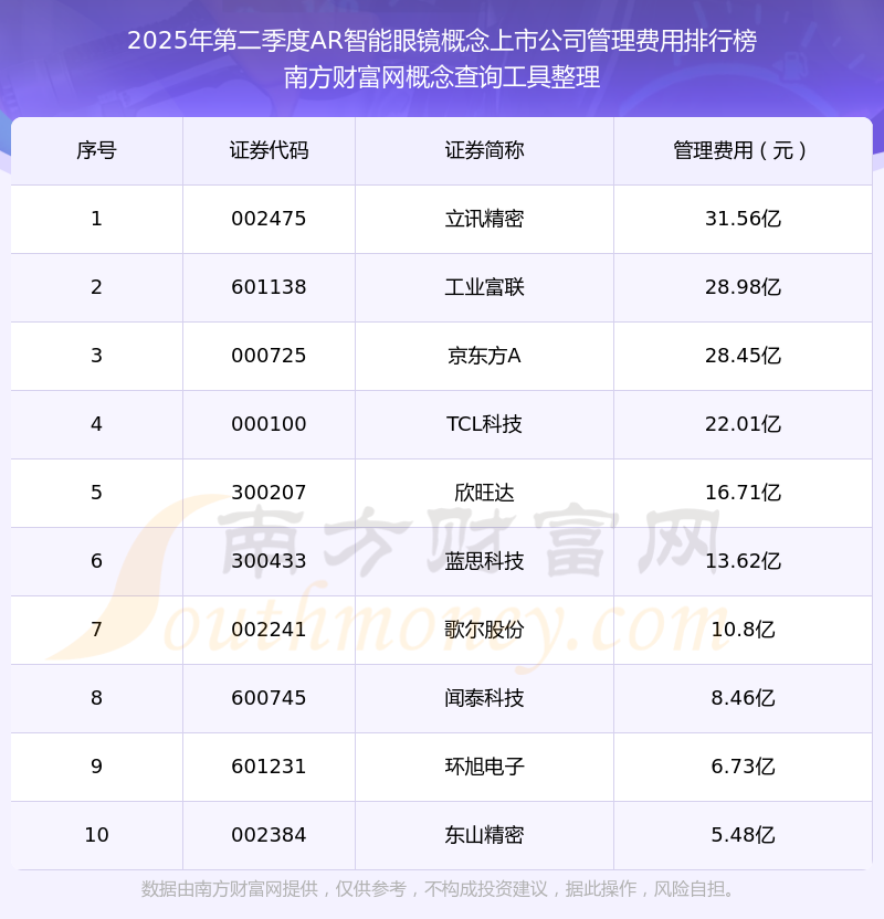 2025年第二季度,AR智能眼鏡概念上市公司管理費用排行榜中,立訊精密(002475)的管理費用總額高達31.56億,工業(yè)富聯(lián)(601138)和京東方A(000725)分別位居第二和第三,TCL科技(000100)、欣旺達(300207)、藍思科技(300433)、歌爾股份(002241)、聞泰科技(600745)、環(huán)旭電子(601231)、東山精密(002384)分別進入前十,其管理費用總額分別排名第4-10名。