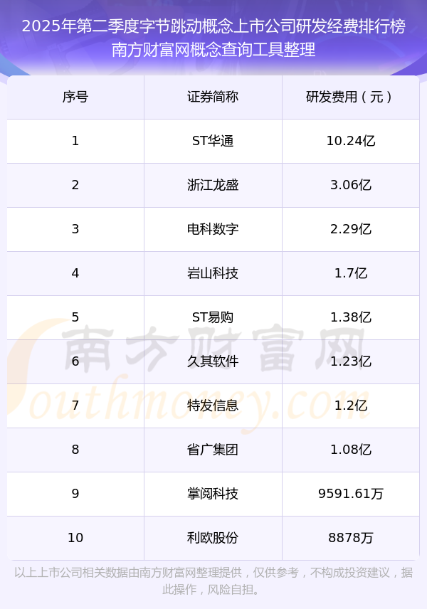 2025年第二季度,字節(jié)跳動概念上市公司研發(fā)經(jīng)費排行榜中,ST華通(002602)研發(fā)經(jīng)費總額高達10.24億,浙江龍盛(600352)和電科數(shù)字(600850)排名第二和第三,巖山科技(002195)、ST易購(002024)、久其軟件(002279)、特發(fā)信息(000070)、省廣集團(002400)、掌閱科技(603533)、利歐股份(002131)進入前十,研發(fā)經(jīng)費總額分別排名第4-10名。