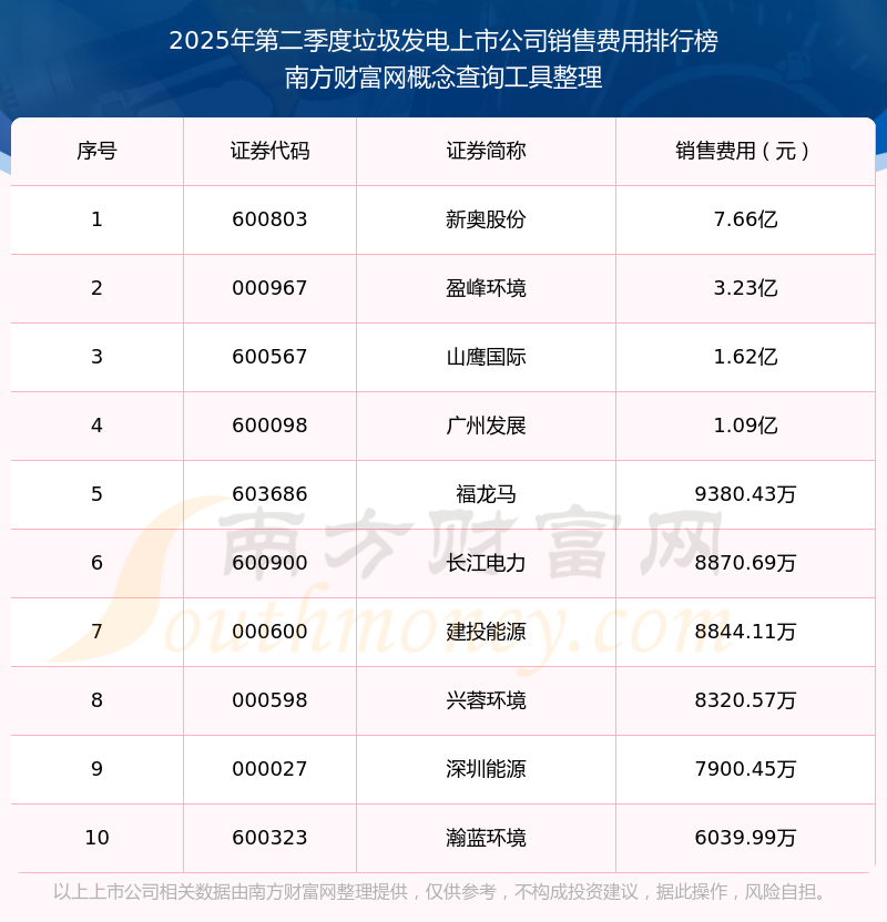 2025年第二季度,垃圾發(fā)電上市公司銷售費(fèi)用排行榜如下:新奧股份(600803)的銷售費(fèi)用總額高達(dá)7.66億,盈峰環(huán)境(000967)和山鷹國(guó)際(600567)分別位居第二和第三,廣州發(fā)展(600098)、福龍馬(603686)、長(zhǎng)江電力(600900)、建投能源(000600)、興蓉環(huán)境(000598)、深圳能源(000027)、瀚藍(lán)環(huán)境(600323)分別進(jìn)入前十,其銷售費(fèi)用總額分別排名第4-10名。
