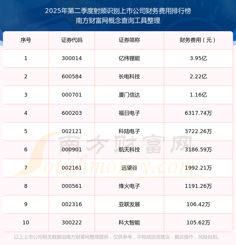 2025年第二季度,射頻識別上市公司財務(wù)費用排行榜中,億緯鋰能(300014)財務(wù)費用總額高達(dá)3.95億,長電科技(600584)和廈門信達(dá)(000701)位居第二和第三,福日電子(600203)、科陸電子(002121)、航天科技(000901)、遠(yuǎn)望谷(002161)、烽火電子(000561)、亞聯(lián)發(fā)展(002316)、科大智能(300222)進(jìn)入前十,財務(wù)費用總額分別排名第4-10名。