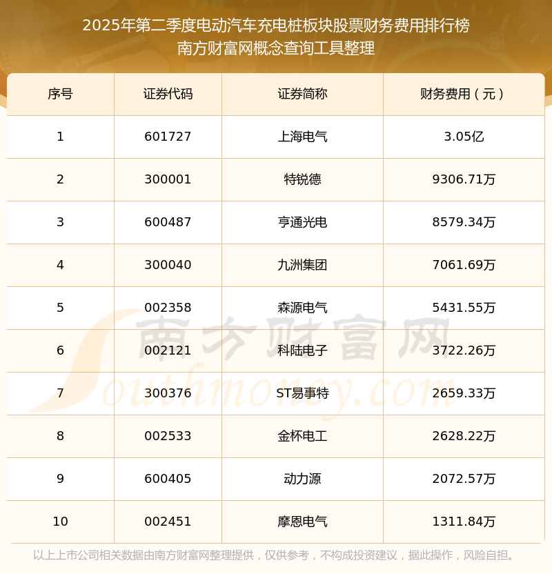 2025年第二季度,電動(dòng)汽車(chē)充電樁板塊股票財(cái)務(wù)費(fèi)用排行榜中,上海電氣(601727)財(cái)務(wù)費(fèi)用總額高達(dá)3.05億,特銳德(300001)和亨通光電(600487)位居第二和第三,九洲集團(tuán)(300040)、森源電氣(002358)、科陸電子(002121)、ST易事特(300376)、金杯電工(002533)、動(dòng)力源(600405)、摩恩電氣(002451)進(jìn)入前十,財(cái)務(wù)費(fèi)用總額分別排名第4-10名。