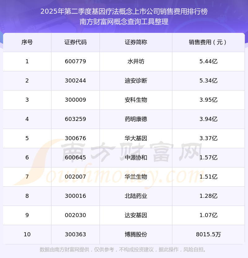 2025年第二季度,基因療法概念上市公司銷售費(fèi)用排名中,水井坊(600779)銷售費(fèi)用總額高達(dá)5.44億,迪安診斷(300244)和安科生物(300009)排名第二和第三,藥明康德(603259)、華大基因(300676)、中源協(xié)和(600645)、華蘭生物(002007)、北陸藥業(yè)(300016)、達(dá)安基因(002030)、博騰股份(300363)進(jìn)入前十,銷售費(fèi)用總額分別排名第4-10名。