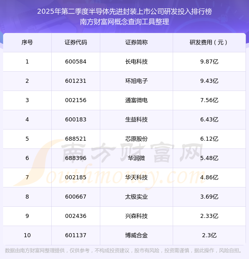 2025年第二季度,半導(dǎo)體先進(jìn)封裝上市公司研發(fā)投入排行榜中,長(zhǎng)電科技(600584)研發(fā)投入總額高達(dá)9.87億,環(huán)旭電子(601231)和通富微電(002156)排名第二和第三,生益科技(600183)、芯原股份(688521)、華潤(rùn)微(688396)、華天科技(002185)、太極實(shí)業(yè)(600667)、興森科技(002436)、博威合金(601137)進(jìn)入前十,研發(fā)投入總額分別排名第4-10名。