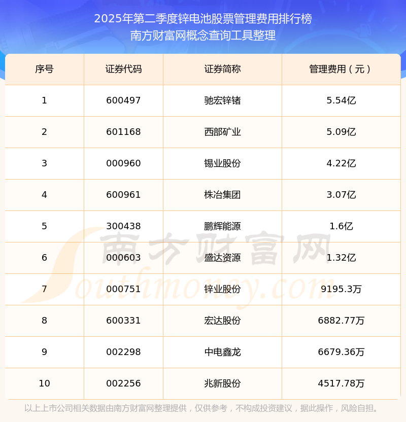 2025年第二季度,鋅電池股票管理費用排行榜如下:馳宏鋅鍺(600497)的管理費用總額高達(dá)5.54億,西部礦業(yè)(601168)和錫業(yè)股份(000960)分別排名第二和第三,株冶集團(600961)、鵬輝能源(300438)、盛達(dá)資源(000603)、鋅業(yè)股份(000751)、宏達(dá)股份(600331)、中電鑫龍(002298)、兆新股份(002256)分別進入前十,其管理費用總額分別排名第4-10名。