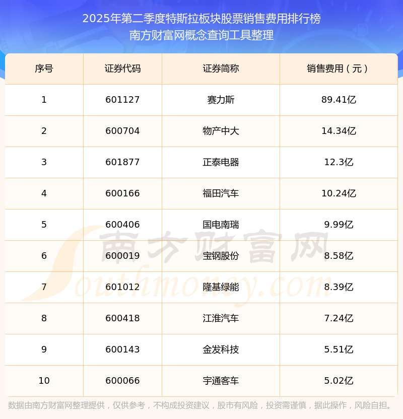 2025年第二季度,特斯拉板塊股票銷售費用排行榜如下:賽力斯(601127)的銷售費用總額高達89.41億,物產(chǎn)中大(600704)和正泰電器(601877)分別位居第二和第三,福田汽車(600166)、國電南瑞(600406)、寶鋼股份(600019)、隆基綠能(601012)、江淮汽車(600418)、金發(fā)科技(600143)、宇通客車(600066)分別進入前十,其銷售費用總額分別排名第4-10名。