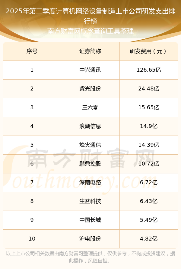 2025年第二季度計算機網(wǎng)絡(luò)設(shè)備制造上市公司研發(fā)支出排行榜如下:中興通訊(000063)研發(fā)支出總額高達126.65億,紫光股份(000938)和三六零(601360)分別位居第二和第三,浪潮信息(000977)、烽火通信(600498)、鵬鼎控股(002938)、深南電路(002916)、生益科技(600183)、中國長城(000066)、滬電股份(002463)分別進入前十,其研發(fā)支出總額分別排名第4-10名。