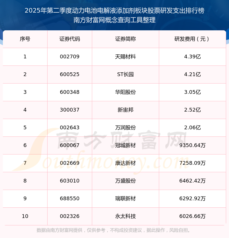 2025年第二季度動力電池電解液添加劑板塊股票研發(fā)支出排行榜如下:天賜材料(002709)研發(fā)支出總額高達4.39億,ST長園(600525)和華陽股份(600348)分別位居第二和第三,新宙邦(300037)、萬潤股份(002643)、冠城新材(600067)、康達新材(002669)、萬盛股份(603010)、瑞聯(lián)新材(688550)、永太科技(002326)分別進入前十,其研發(fā)支出總額分別排名第4-10名。