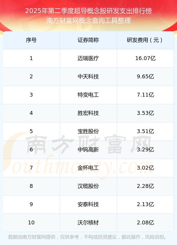 2025年第二季度,超導(dǎo)概念股研發(fā)支出排行榜中,邁瑞醫(yī)療(300760)研發(fā)支出總額高達16.07億,中天科技(600522)和特變電工(600089)排名第二和第三,勝宏科技(300476)、寶勝股份(600973)、中鎢高新(000657)、金杯電工(002533)、漢纜股份(002498)、安泰科技(000969)、沃爾核材(002130)進入前十,研發(fā)支出總額分別排名第4-10名。