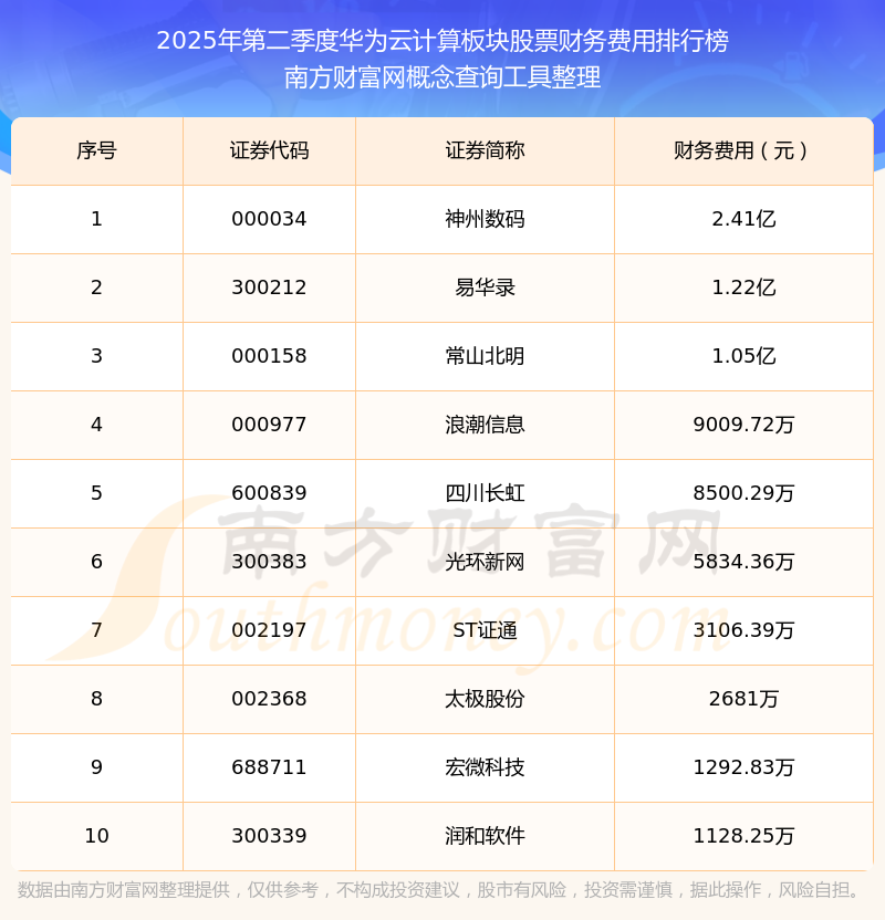 2025年第二季度華為云計(jì)算板塊股票財務(wù)費(fèi)用排行榜如下:神州數(shù)碼(000034)的財務(wù)費(fèi)用總額高達(dá)2.41億,易華錄(300212)和常山北明(000158)分別位居第二和第三,浪潮信息(000977)、四川長虹(600839)、光環(huán)新網(wǎng)(300383)、ST證通(002197)、太極股份(002368)、宏微科技(688711)、潤和軟件(300339)分別進(jìn)入前十,其財務(wù)費(fèi)用總額分別排名第4-10名。