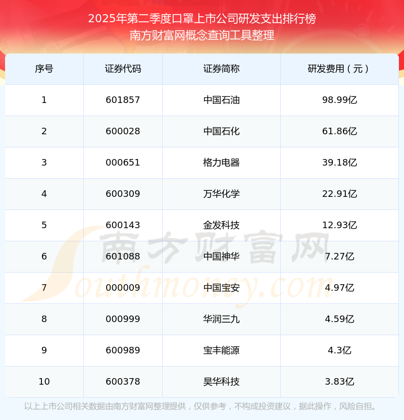 2025年第二季度口罩上市公司研發(fā)支出排行榜如下:中國石油(601857)研發(fā)支出總額高達(dá)98.99億,中國石化(600028)和格力電器(000651)分別位居第二和第三,萬華化學(xué)(600309)、金發(fā)科技(600143)、中國神華(601088)、中國寶安(000009)、華潤三九(000999)、寶豐能源(600989)、昊華科技(600378)分別進(jìn)入前十,其研發(fā)支出總額分別排名第4-10名。