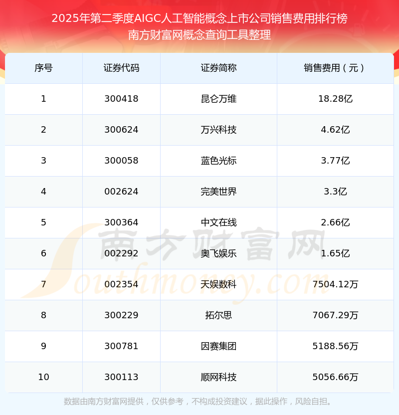 2025年第二季度,AIGC人工智能概念上市公司銷售費用排行榜中,昆侖萬維(300418)銷售費用總額高達18.28億,萬興科技(300624)和藍色光標(300058)位居第二和第三,完美世界(002624)、中文在線(300364)、奧飛娛樂(002292)、天娛數(shù)科(002354)、拓爾思(300229)、因賽集團(300781)、順網(wǎng)科技(300113)進入前十,銷售費用總額分別排名第4-10名。