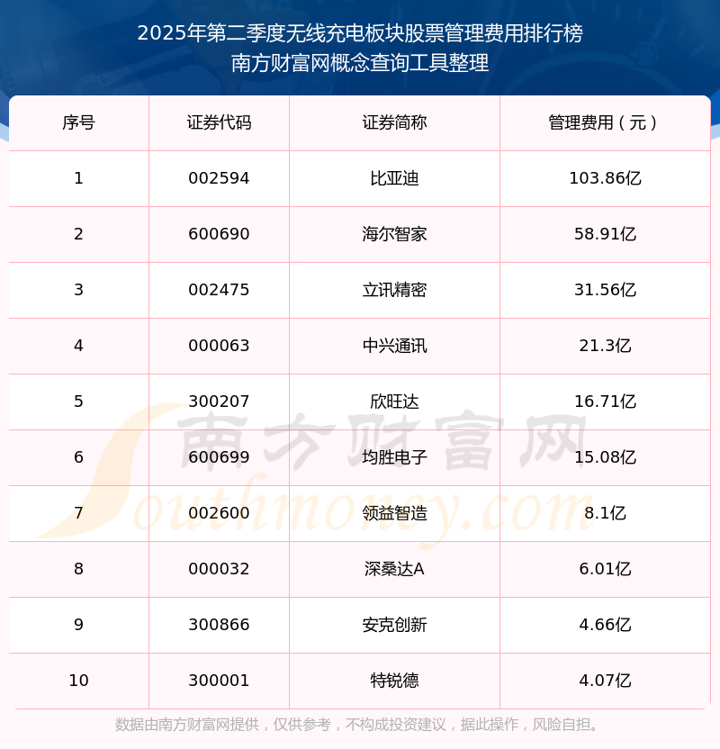 2025年第二季度,無(wú)線充電板塊股票管理費(fèi)用排名中,比亞迪(002594)的管理費(fèi)用總額高達(dá)103.86億,海爾智家(600690)和立訊精密(002475)排名第二和第三,中興通訊(000063)、欣旺達(dá)(300207)、均勝電子(600699)、領(lǐng)益智造(002600)、深桑達(dá)A(000032)、安克創(chuàng)新(300866)、特銳德(300001)進(jìn)入前十,其管理費(fèi)用總額分別排名第4-10名。