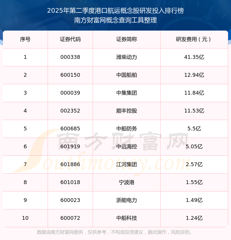 2025年第二季度,港口航運概念股研發(fā)投入排行榜中,濰柴動力(000338)研發(fā)投入總額高達(dá)41.35億,中國船舶(600150)和中集集團(tuán)(000039)排名第二和第三,順豐控股(002352)、中船防務(wù)(600685)、中遠(yuǎn)?兀601919)、江河集團(tuán)(601886)、寧波港(601018)、浙能電力(600023)、中船科技(600072)進(jìn)入前十,研發(fā)投入總額分別排名第4-10名。