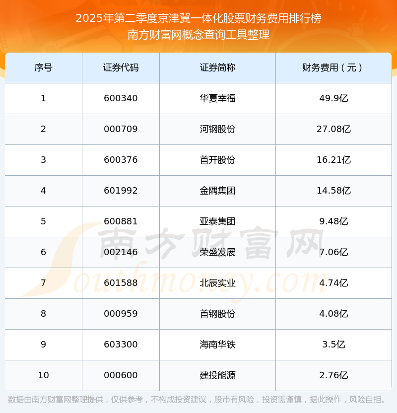 2025年第二季度京津冀一體化股票財(cái)務(wù)費(fèi)用排行榜如下:華夏幸福(600340)的財(cái)務(wù)費(fèi)用總額高達(dá)49.9億,河鋼股份(000709)和首開(kāi)股份(600376)分別排名第二和第三,金隅集團(tuán)(601992)、亞泰集團(tuán)(600881)、榮盛發(fā)展(002146)、北辰實(shí)業(yè)(601588)、首鋼股份(000959)、海南華鐵(603300)、建投能源(000600)分別進(jìn)入前十,其財(cái)務(wù)費(fèi)用總額分別排名第4-10名。