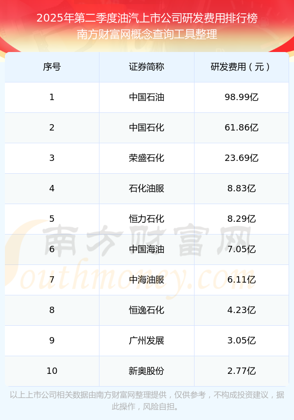 2025年第二季度油汽上市公司研發(fā)費用排行榜如下:中國石油(601857)研發(fā)費用總額高達98.99億,中國石化(600028)和榮盛石化(002493)分別位居第二和第三,石化油服(600871)、恒力石化(600346)、中國海油(600938)、中海油服(601808)、恒逸石化(000703)、廣州發(fā)展(600098)、新奧股份(600803)分別進入前十,其研發(fā)費用總額分別排名第4-10名。