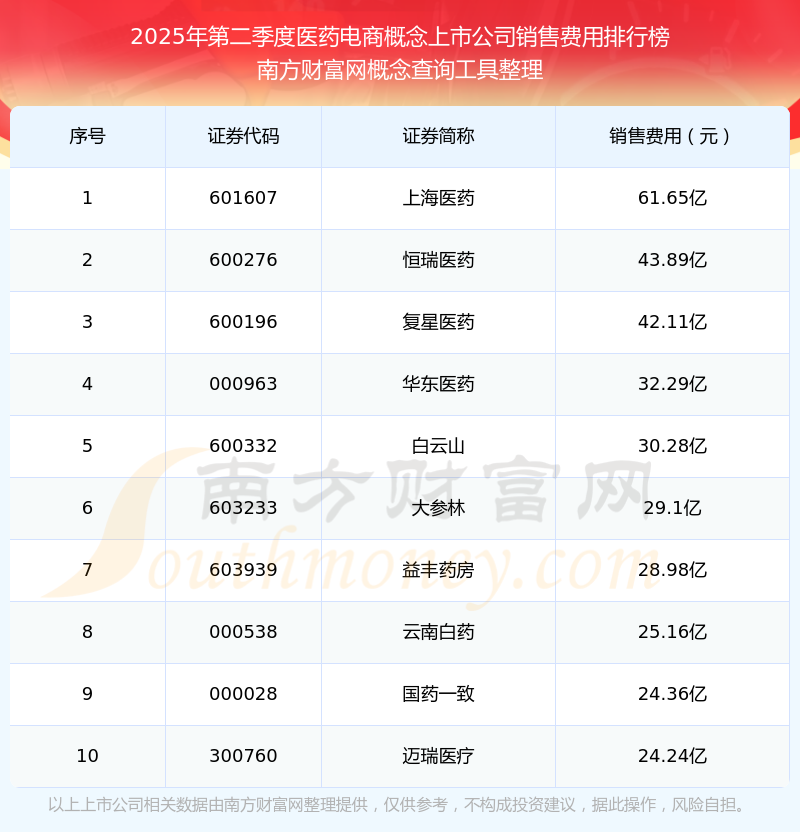 2025年第二季度醫(yī)藥電商概念上市公司銷售費(fèi)用排行榜如下:上海醫(yī)藥(601607)的銷售費(fèi)用總額高達(dá)61.65億,恒瑞醫(yī)藥(600276)和復(fù)星醫(yī)藥(600196)分別位居第二和第三,華東醫(yī)藥(000963)、白云山(600332)、大參林(603233)、益豐藥房(603939)、云南白藥(000538)、國藥一致(000028)、邁瑞醫(yī)療(300760)分別進(jìn)入前十,其銷售費(fèi)用總額分別排名第4-10名。