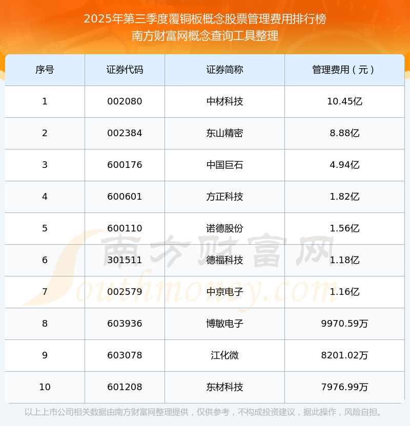 2025年第三季度,覆銅板概念概念股票管理費(fèi)用排名如下:中材科技(002080)的管理費(fèi)用總額高達(dá)10.45億,東山精密(002384)和中國巨石(600176)位居第二和第三,方正科技(600601)、諾德股份(600110)、德?萍迹301511)、中京電子(002579)、博敏電子(603936)、江化微(603078)、東材科技(601208)分別進(jìn)入前十,其管理費(fèi)用總額分別排名第4-10名。