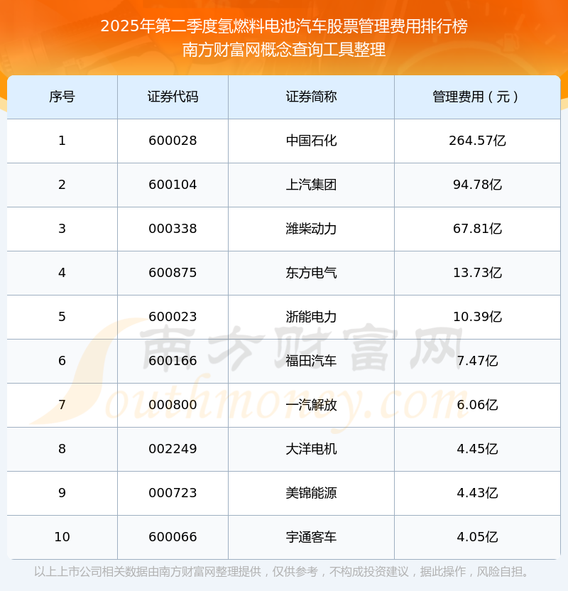 2025年第二季度,氫燃料電池汽車(chē)股票管理費(fèi)用排行榜中,中國(guó)石化(600028)的管理費(fèi)用總額高達(dá)264.57億,上汽集團(tuán)(600104)和濰柴動(dòng)力(000338)分別位居第二和第三,東方電氣(600875)、浙能電力(600023)、福田汽車(chē)(600166)、一汽解放(000800)、大洋電機(jī)(002249)、美錦能源(000723)、宇通客車(chē)(600066)分別進(jìn)入前十,其管理費(fèi)用總額分別排名第4-10名。